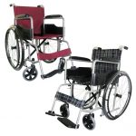 Ruedas traseras radiales inflables de 26, ruedas delanteras giratorias macizas de 5″, asiento y espaldar en nylon polister, aros impulsadores en PVC, descansabrazos fijos, descansapies abatibles y de altura graduable, manubrios en PVC, asiento y espaldar de 46 x 40 cms, medida total 63 x 90 cms, peso aprox. 16 Kgs.